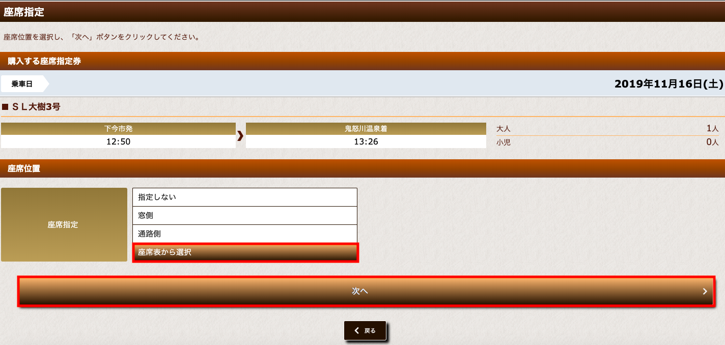 座席の指定方法を「座席表から選択」を選んで「次へ」をクリックしてください。